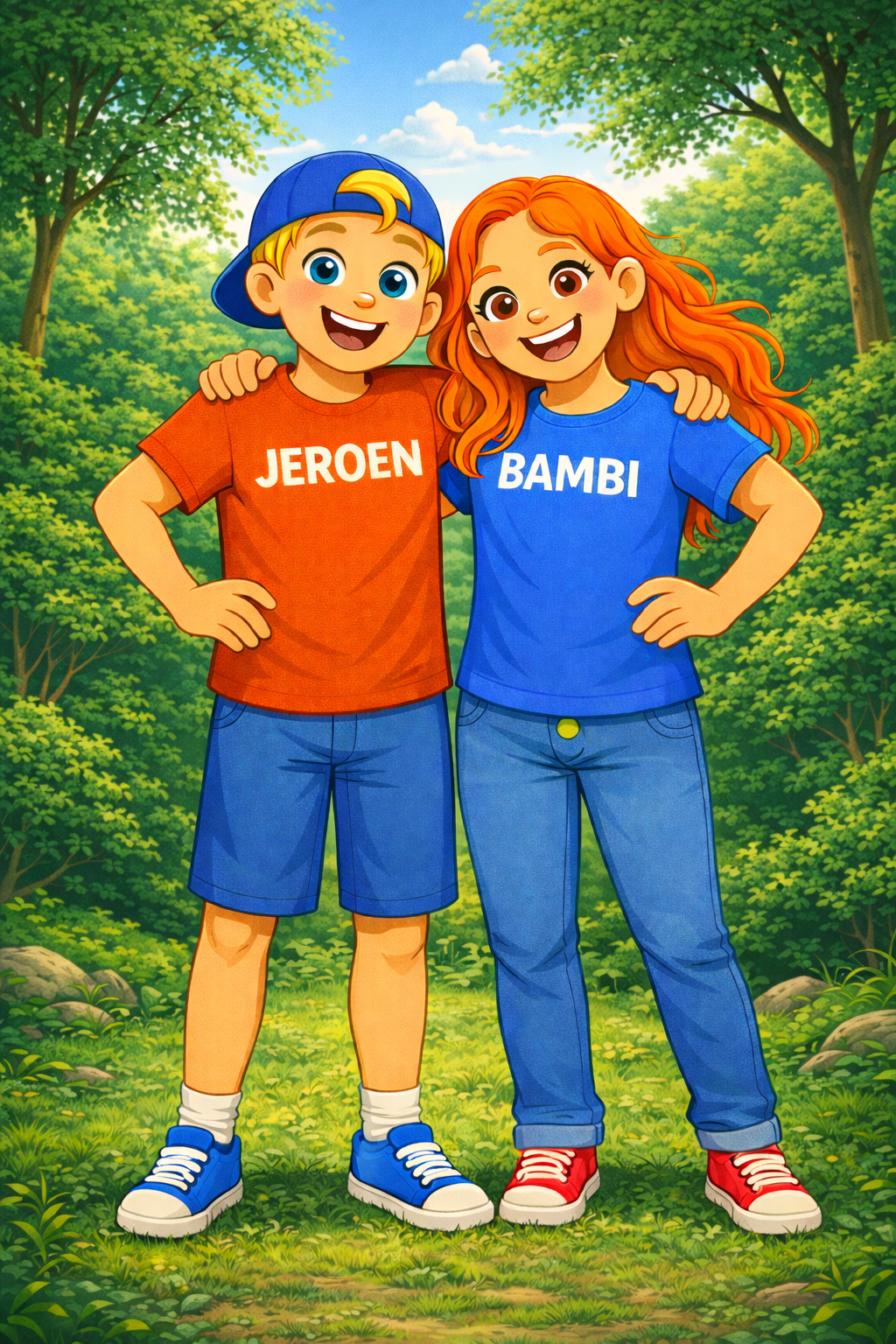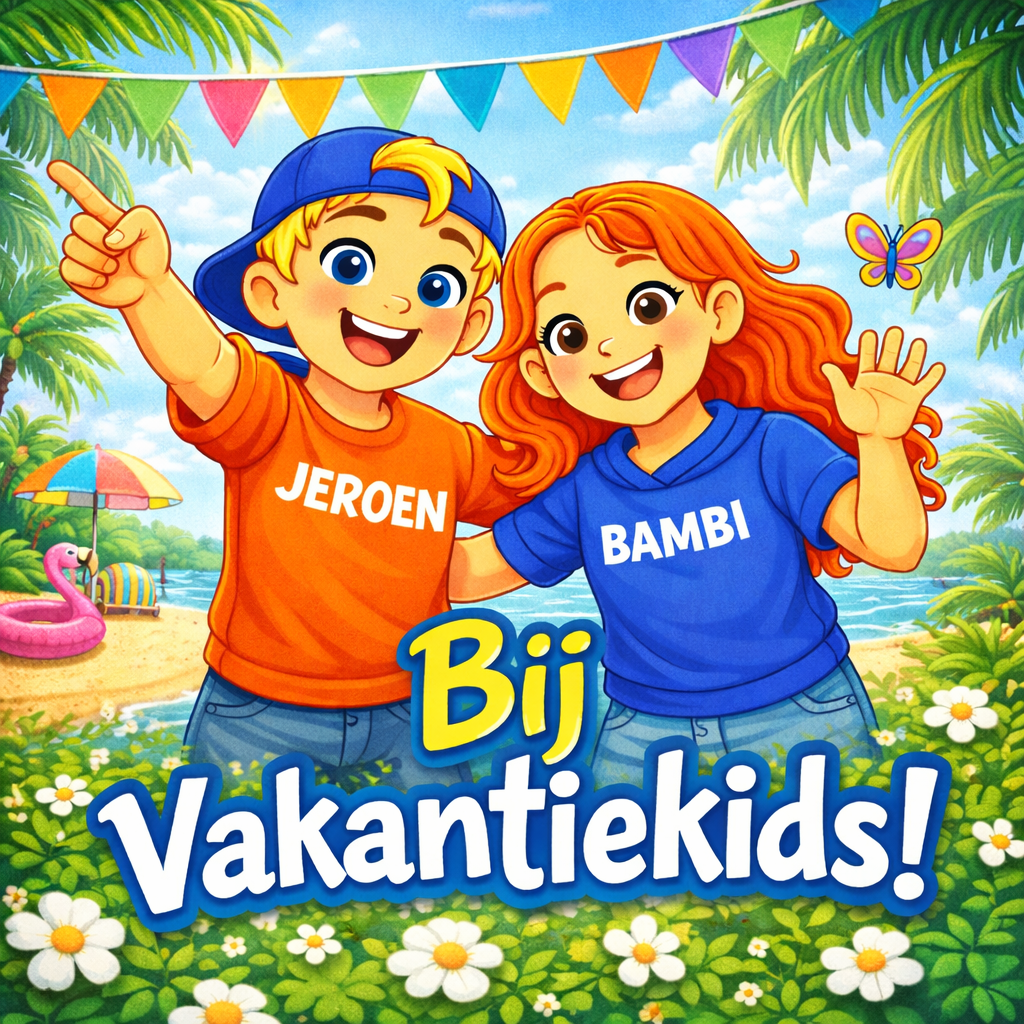 Jeroen en Bambi, twee vrienden met ieder hun eigen karakter, die samen staan voor Vakantiekids: samen spelen, ontdekken en plezier maken.
